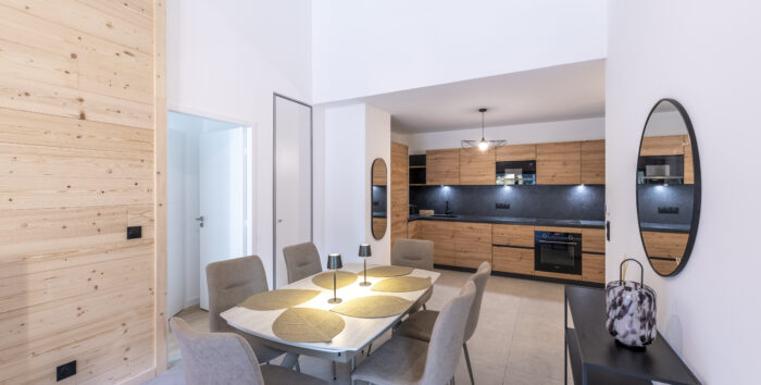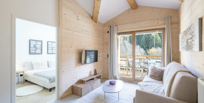 Qu’il s’agisse des parquets ou des carrelages grès, les finitions intérieures ont été soigneusement sélectionnées pour créer de véritables cocons. Ici, chaque détail contribue à la création d’un ensemble douillet, proche de l’esprit chalet. Côté équipements, chaque appartement dispose d’un cellier sur le pallier, pour faciliter et optimiser les rangements pendant les périodes de location.