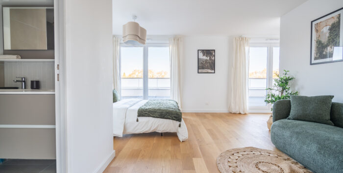 Deux autres chambres de 13 m² et 12 m² composent l’appartement, elles ont toutes les deux un accès à l’espace extérieur du logement.